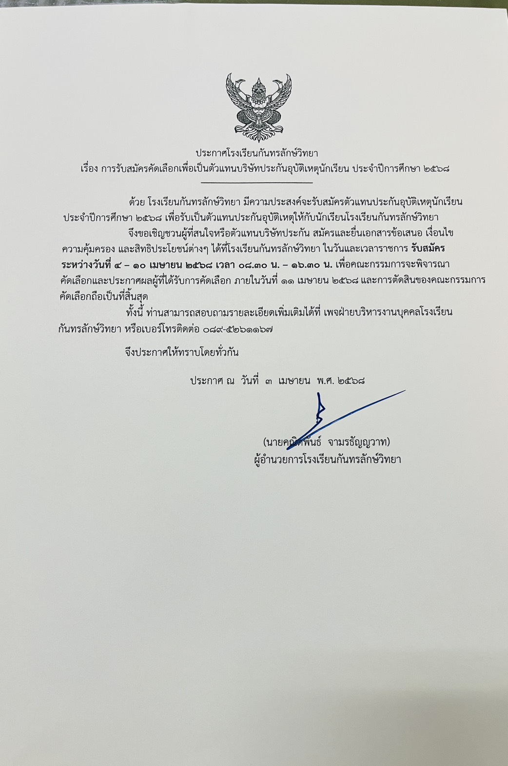 ประกาศผลการสอบคัดเลือกบุคคลเพื่อเป็นลูกจ้างชั่วคราว ตำแหน่ง เจ้าหน้าที่ธุรการโรงเรียน ประกาศ ณ วันที่ 24 มกราคม 2568
