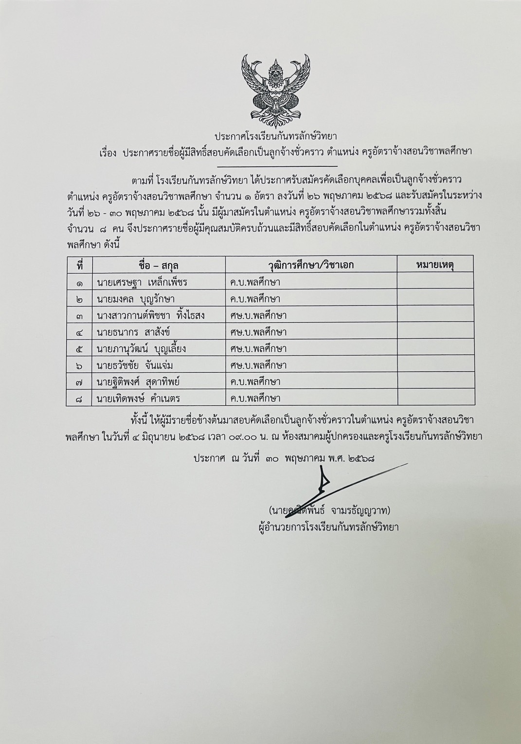 ประกาศผลการสอบคัดเลือกบุคคลเพื่อเป็นลูกจ้างชั่วคราว ตำแหน่ง ครูอัตราจ้างชาวต่างชาติ (List of foreigners who pass the interview and can work in 2024 Academic year at Kantharalakwittaya School) ประกาศ ณ วันที่ 4 เมษายน 2567