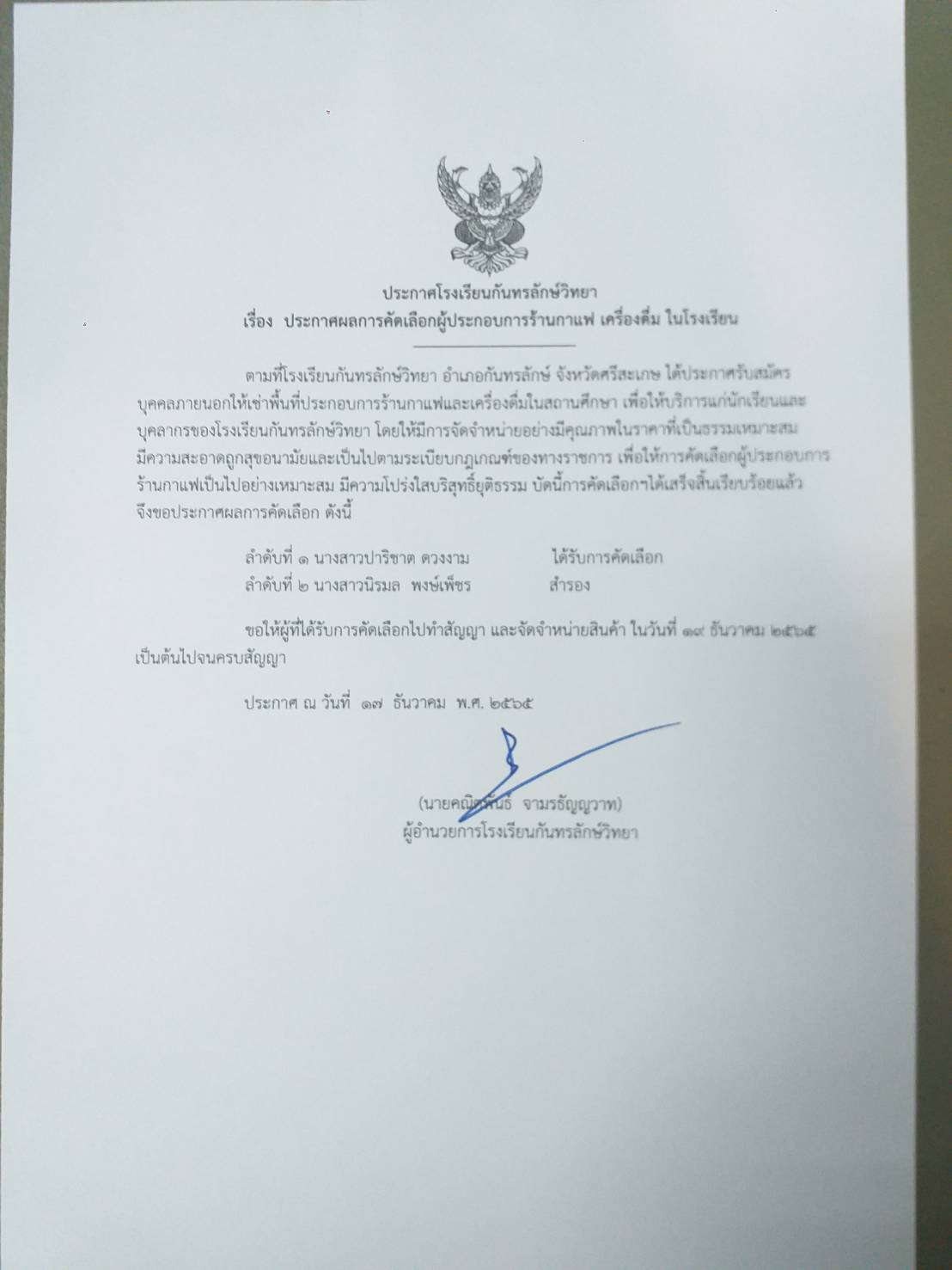ประกาศ เรื่อง ผลการคัดเลือกผู้ประกอบการร้านกาแฟ เครื่องดื่ม ในโรงเรียน ประกาศ ณ วันที่ 17 ธันวาคม 2565