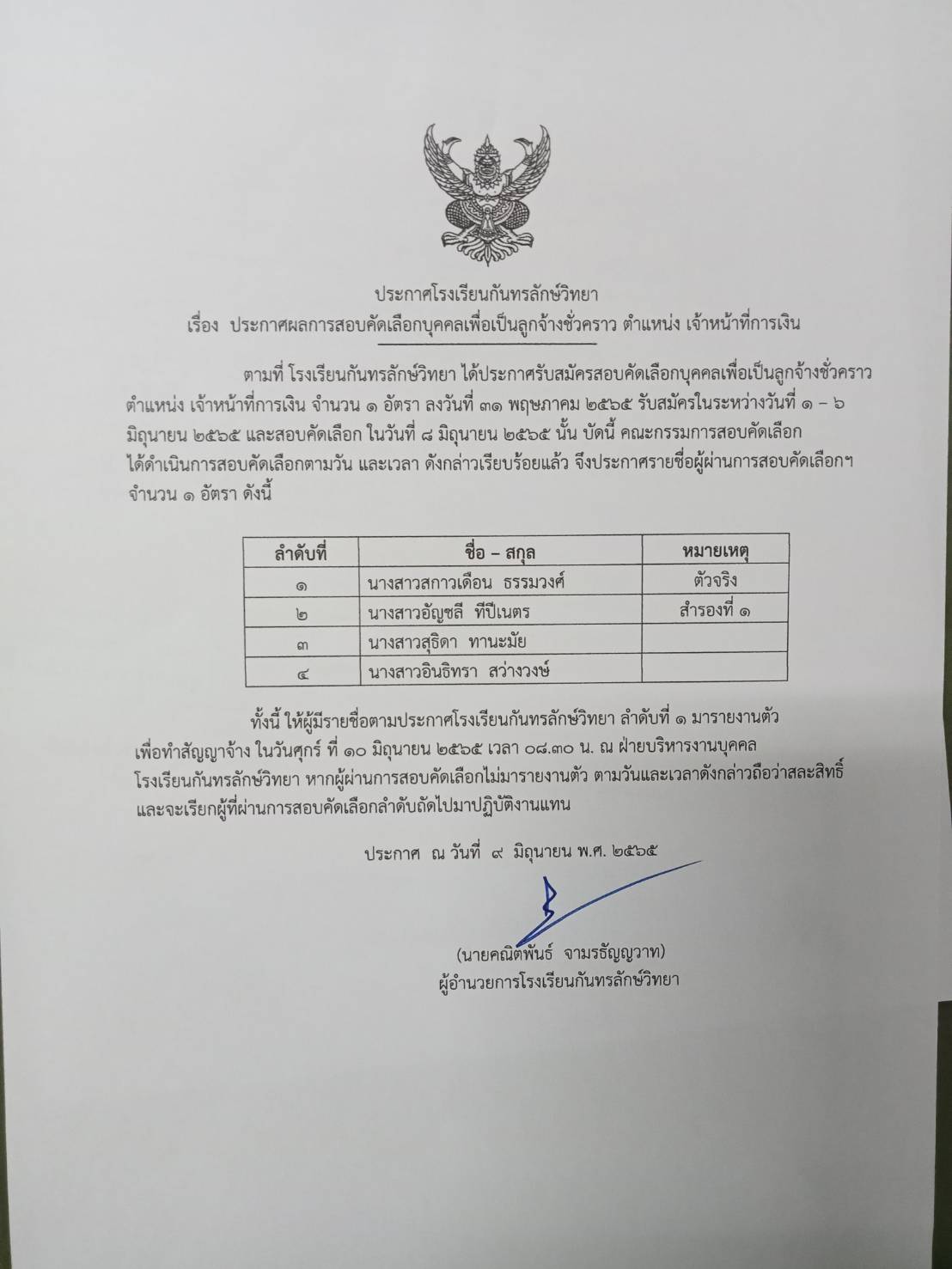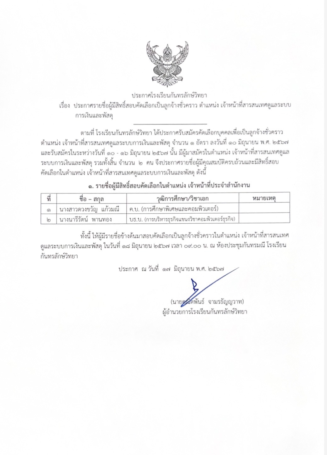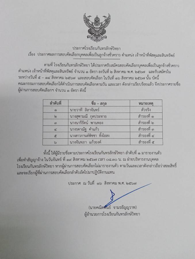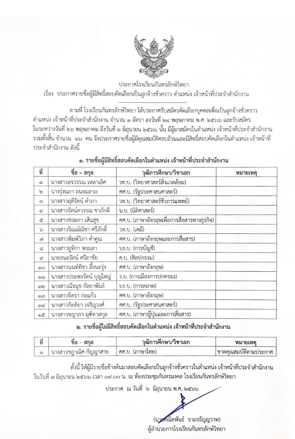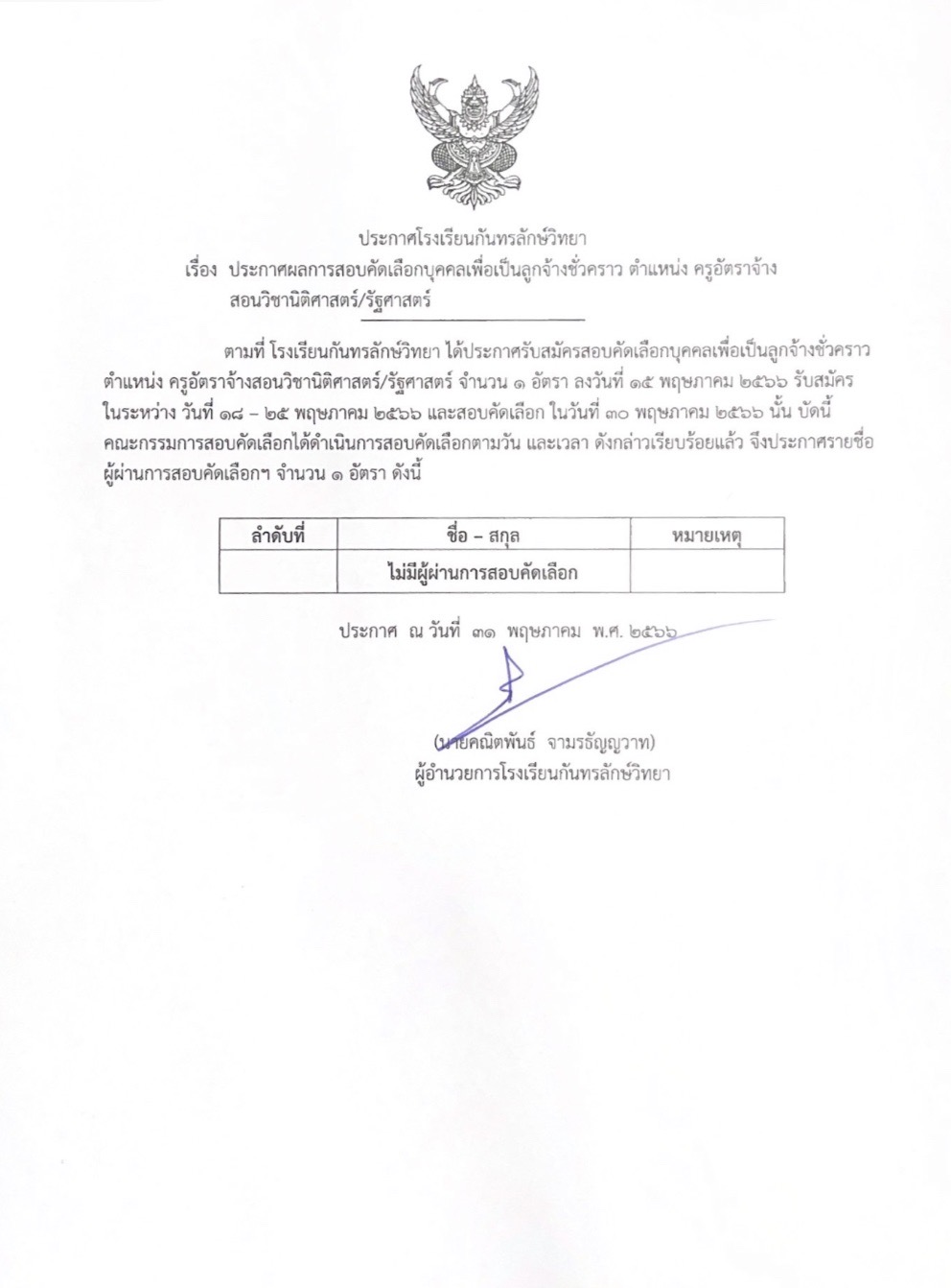 ประกาศผลการสอบคัดเลือกบุคคลเพื่อเป็นลูกจ้างชั่วคราว ตำแหน่ง ครูอัตราจ้างชาวต่างชาติ (List of foreigners who pass the interview and can work in 2024 Academic year at Kantharalakwittaya School) ประกาศ ณ วันที่ 4 เมษายน 2567