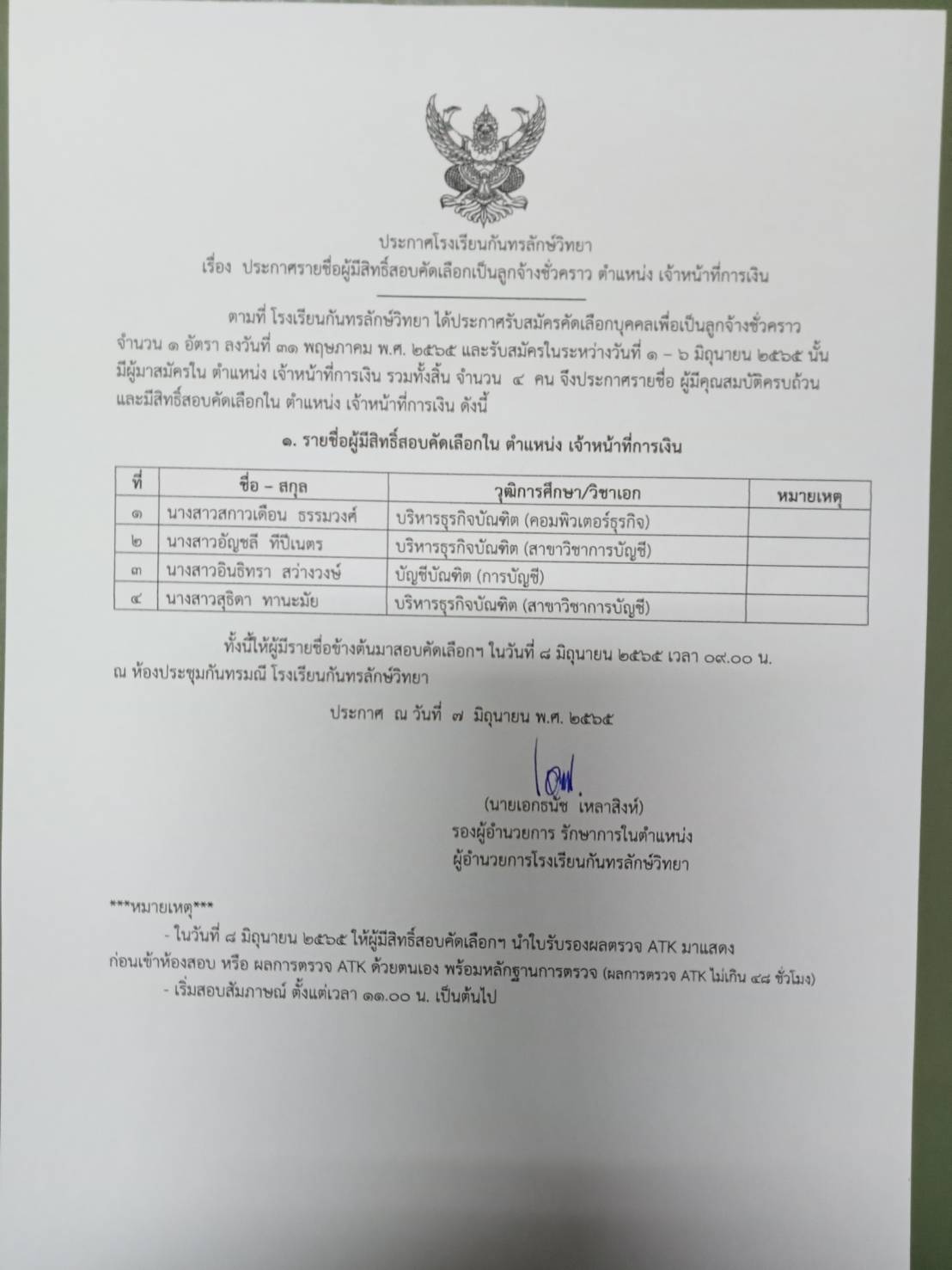 ประกาศ เรื่อง ประกาศรายชื่อผู้มีสิทธิ์สอบคัดเลือกเป็นลูกจ้างชั่วคราว ตำแหน่ง เจ้าหน้าที่การเงิน ประกาศ ณ วันที่ 7 มิ.ย. 2565