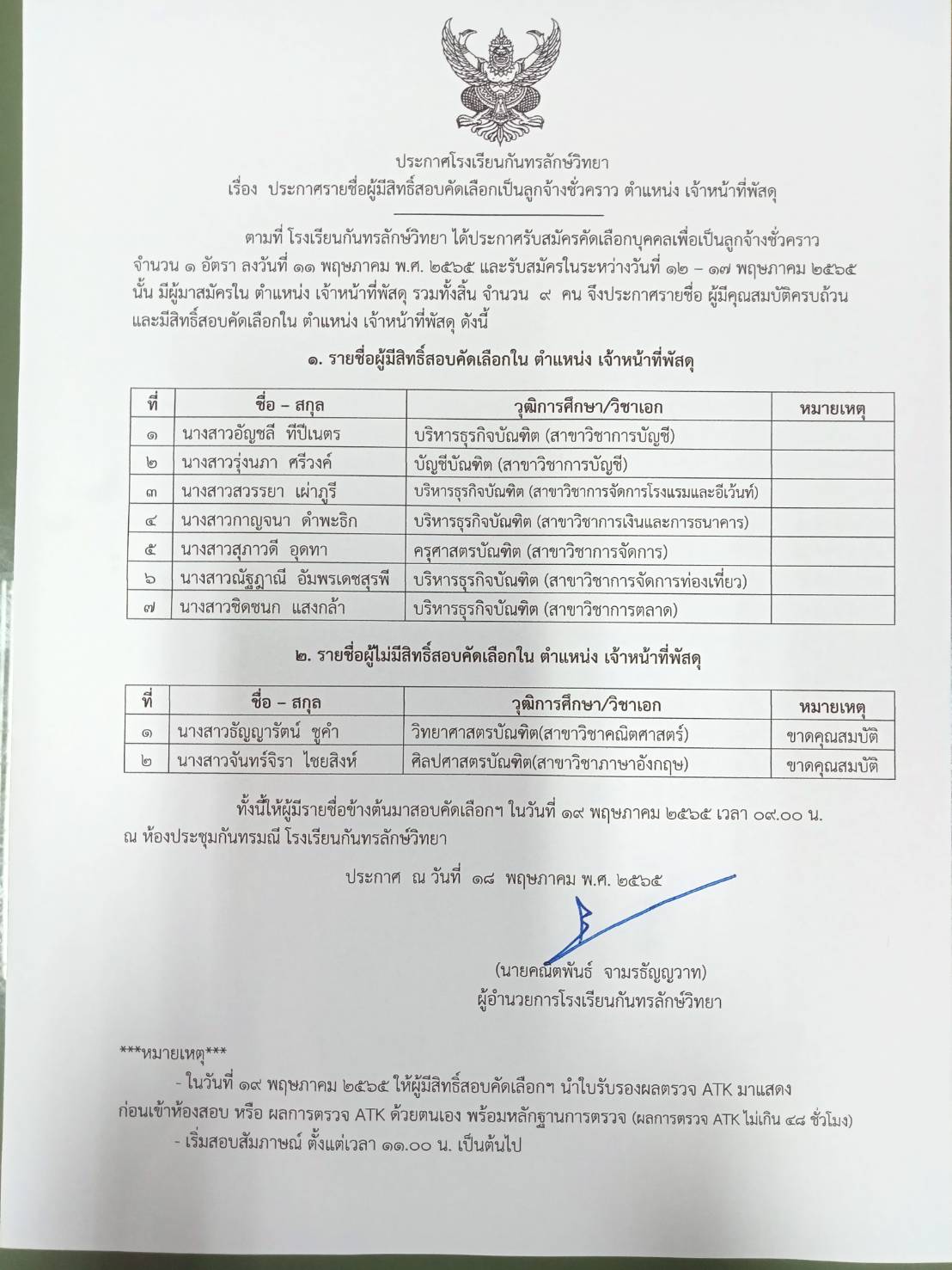 ประกาศ เรื่อง ประกาศรายชื่อผู้มีสิทธิ์สอบคัดเลือกเป็นลูกจ้างชั่วคราว ตำแหน่ง เจ้าหน้าที่พัสดุ ประกาศ ณ วันที่ 18 พ.ค. 2565