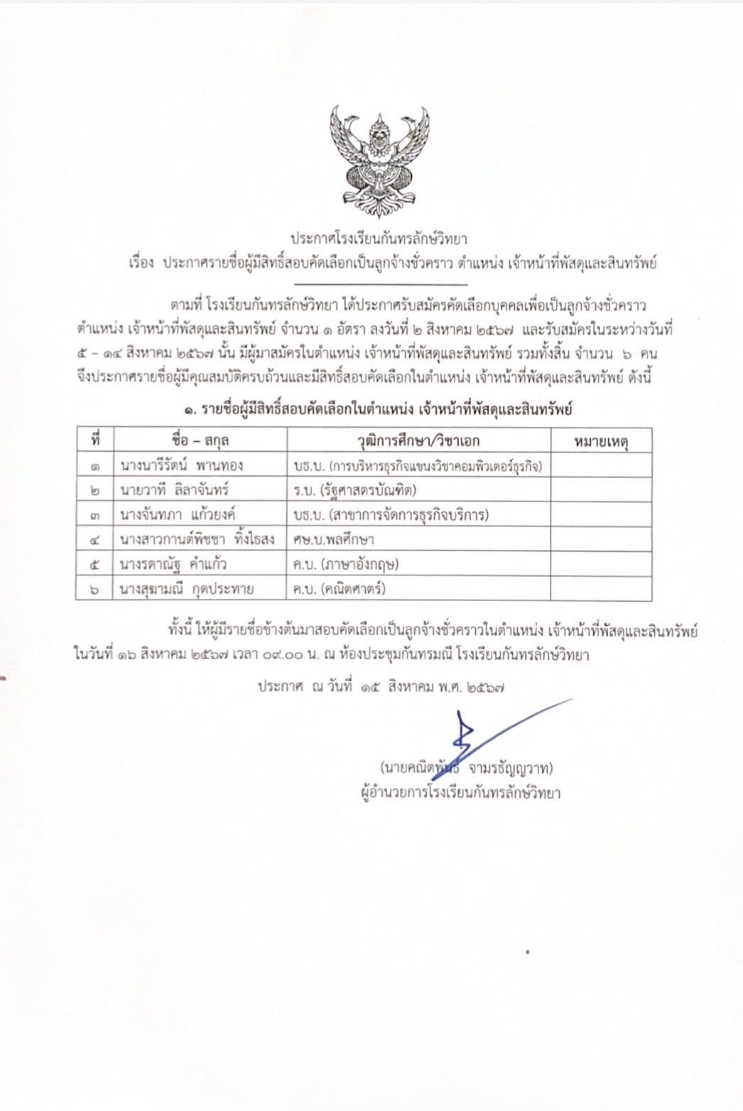 ประกาศรายชื่อผู้มีสิทธิ์สอบคัดเลือกเป็นลูกจ้างชั่วคราว ตำแหน่ง เจ้าหน้าที่พัสดุและสินทรัพย์ ประกาศ ณ วันที่ 15 สิงหาคม 2567