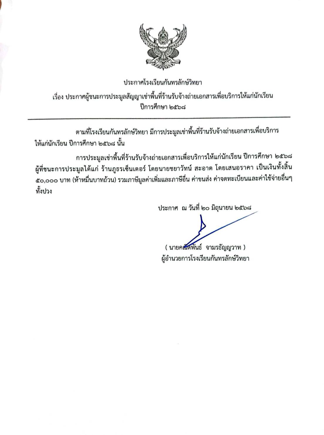 ประกาศผู้ชนะการประมูลเช่าพื้นที่เป็นสถานที่ให้บริการถ่ายเอกสาร จำนวน 1 ร้าน ประกาศ ณ วันที่ 29 กุมภาพันธ์ 2567