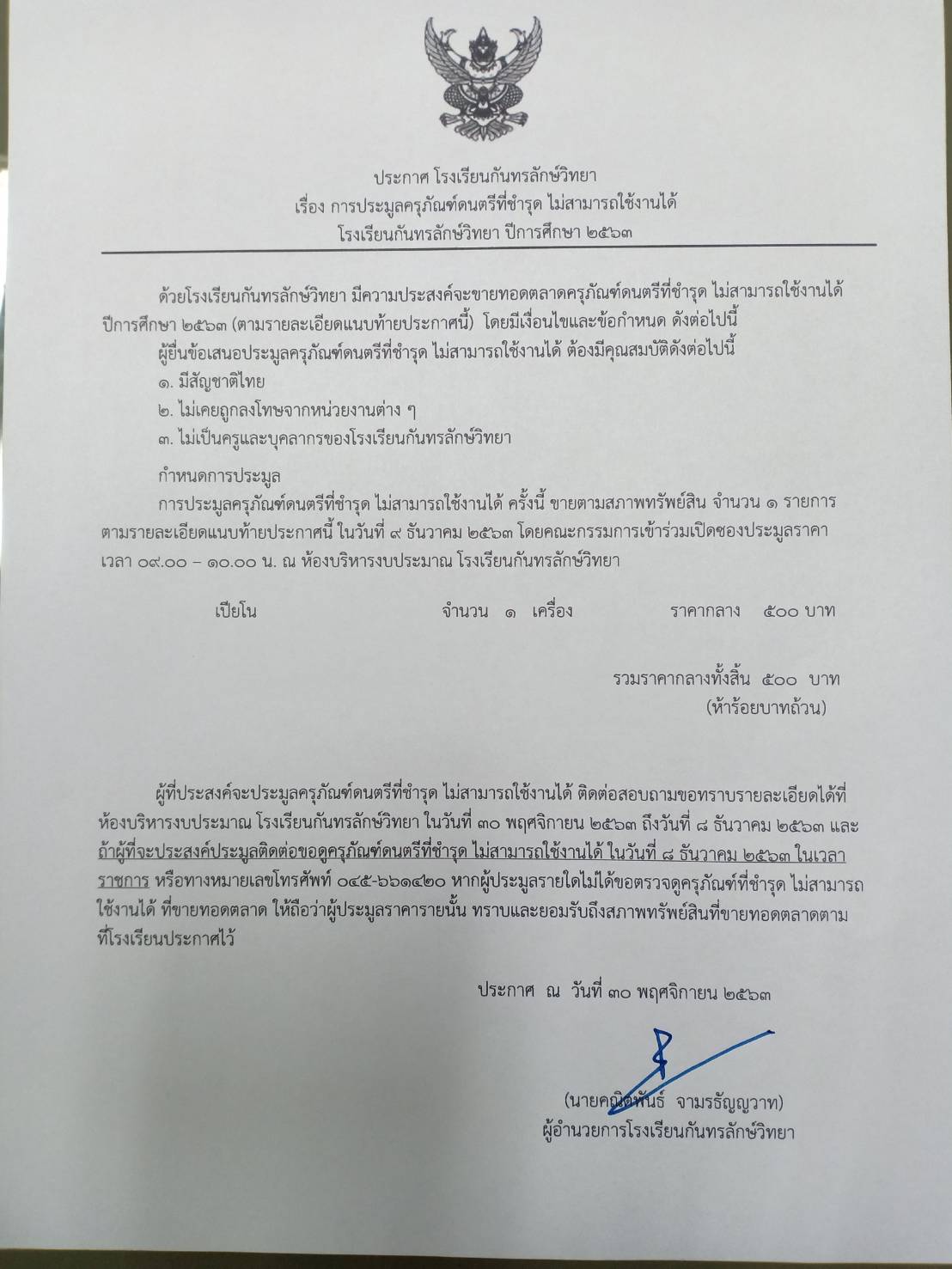 ประกาศ เรื่อง การประมูลครุภัณฑ์ครุภัณฑ์ดนตรีที่ชำรุด ไม่สามารถใช้งานได้ โรงเรียนกันทรลักษ์วิทยา ปีการศึกษา 2563 ประกาศ ณ วันที่ 30 พ.ย. 2563